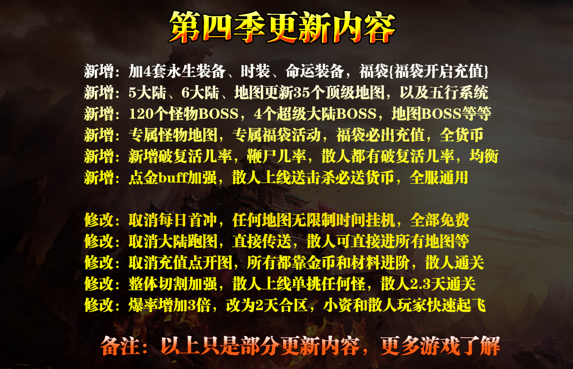 新年特别版:每天稳定开放12个新区,第2天合区,晚上18:00合成20.00攻城,第四季更新内容如下